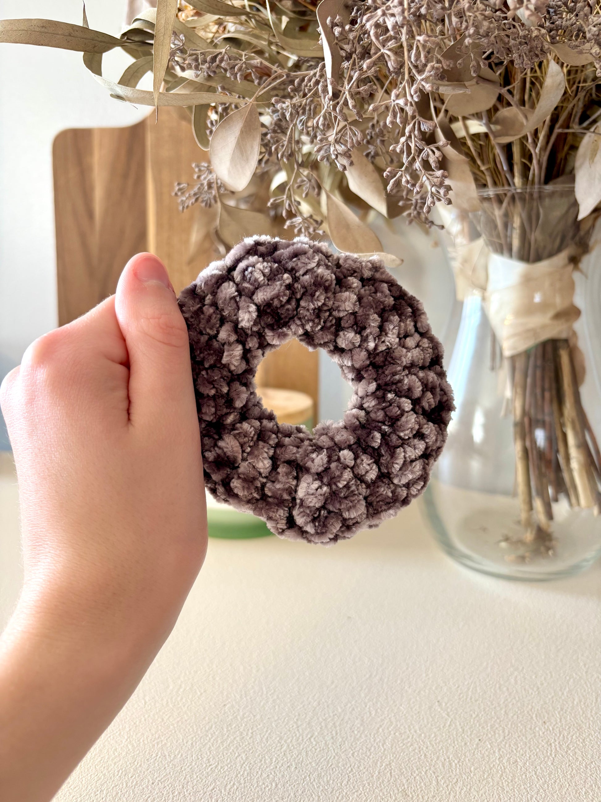 Hand-crocheted with soft velvet-style yarn for a plush, gentle hold. Perfect for everyday wear, comfortable on the hair, and great for adding a cozy touch to any style.